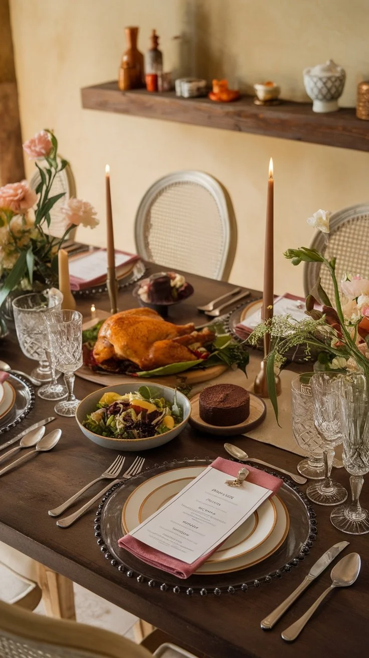 Your dinner party can be elevated with a thoughtful menu presentation that embraces visual hierarchy. The image captures a beautifully set table that invites guests to enjoy a delightful meal. The warm tones of the candles and the elegant dishes create a cozy yet sophisticated vibe.